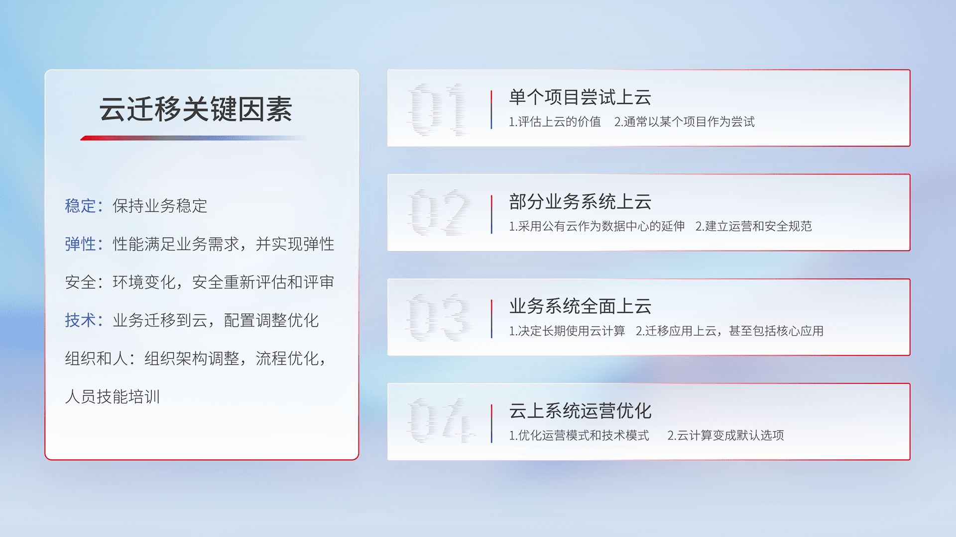 结合实际业务,,,从规划设计、、云平台选型、、、、云原生改造、、、、数据迁移、、、集成交付,,,迁移全过程为客户识别最佳上云路径,,,,做好风险识别管理,,,,设计网络架构、、、身份权限、、安全审计合规、、、操作审计、、、日志审计、、、监控告警策略、、多站点容灾设计等,,对云上基础设施进行整体规划,,,提升IT治理水平,,以满足弹性、、高可用、、、高性能的需求。。。。