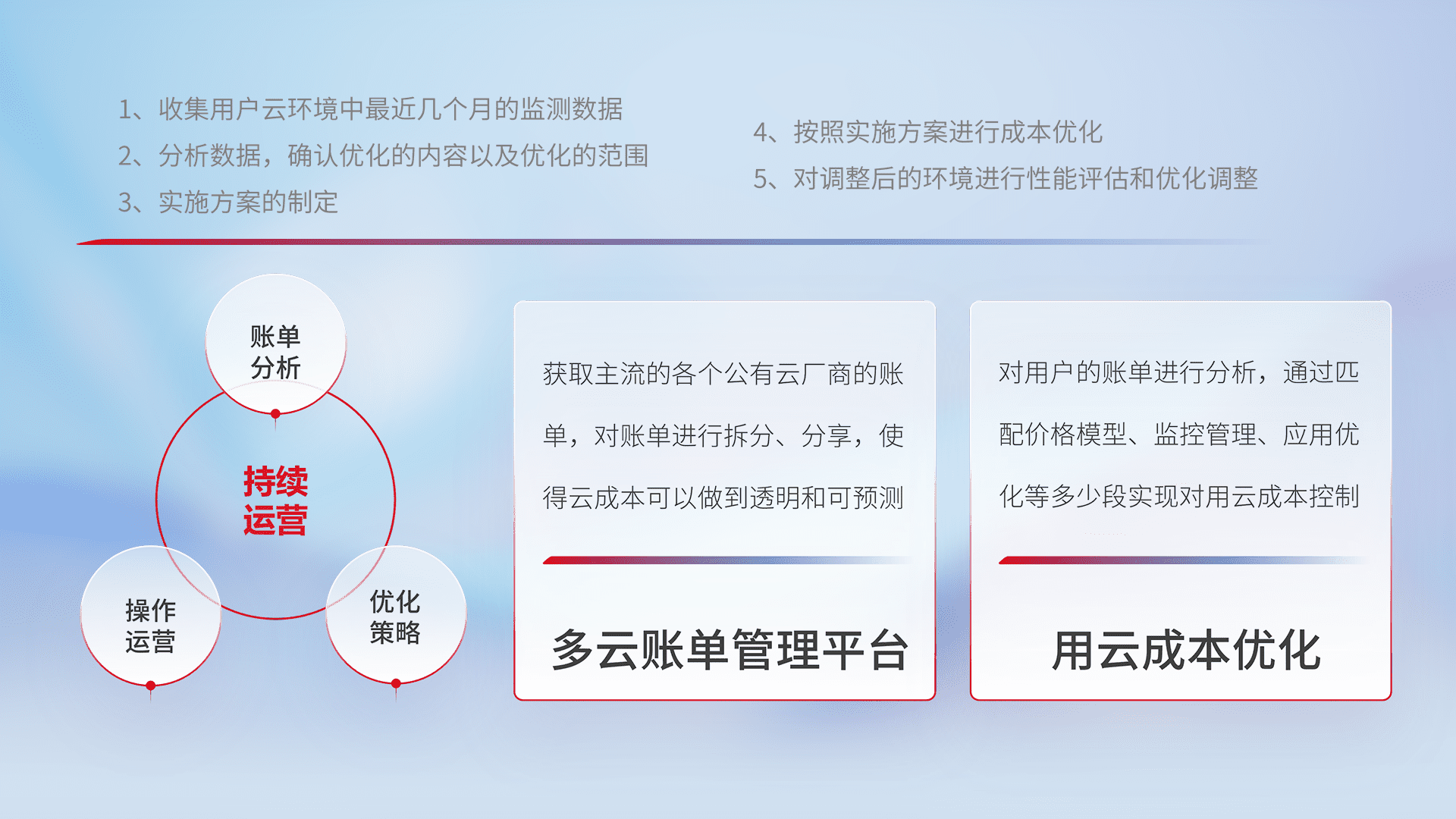 通过多云纳管,,,以统一的资源数据模型把客户的云资源进行抽象和封装,,进而实现对多云资源的统一操作,,保障云资源管理的可靠性、、、稳定性与可用性。。。。量身定制化运维内容,,,配置、、、、开发运维、、补丁管理、、、、备份、、、监控、、、认证和访问管理、、审计和日常巡检等,,,,保障在用云过程中的可靠度,,稳定度以及高可用率。。